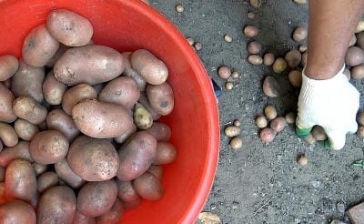 Jos perunat ovat vahingoittuneita tai liian pieniä, ne voidaan lähettää kompostiin. Kauden kuluttsiitä tulee ravitsevaa lannoitetta kasvimaalle.